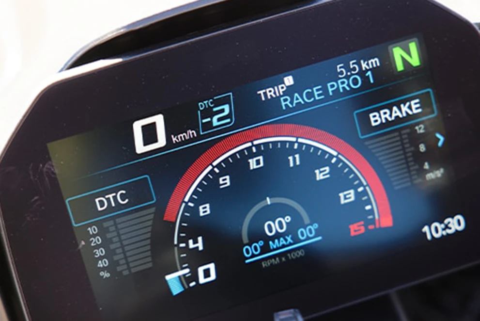 O Controle de Tração Dinâmico (DTC) com o novo sensor de ângulo de direção permite duas novas funcionalidades: Assistente de Deslizamento em Frenagem (Brake Slide Assist) e o Assistente de Controle de Deslizamento (Slide Control). O novo sensor de ângulo de direção mede seu ângulo de posição do guidão e, em conjunto com o DTC, auxilia no deslizamento ideal. As configurações 2 e 3 do DTC foram otimizadas para a pista de corrida e pneus slicks.